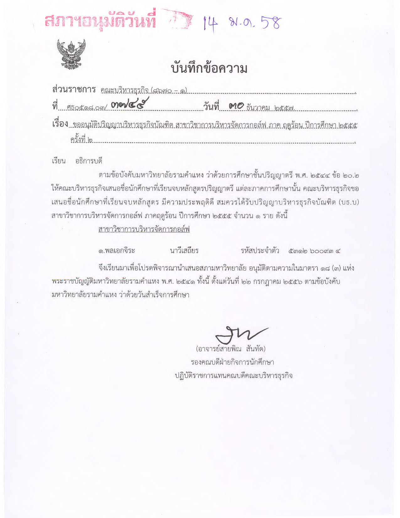 ขออนุมัติปริญญาบริหารธุรกิจบัณฑิต สาขาวิชาการบริหารจัดการกอล์ฟ ภาคฤดูร้อน ปีการศึกษา 2555 ครั้งที่ 2Written by RU Golf Bachelor | | | Hits: 2158 Tweet