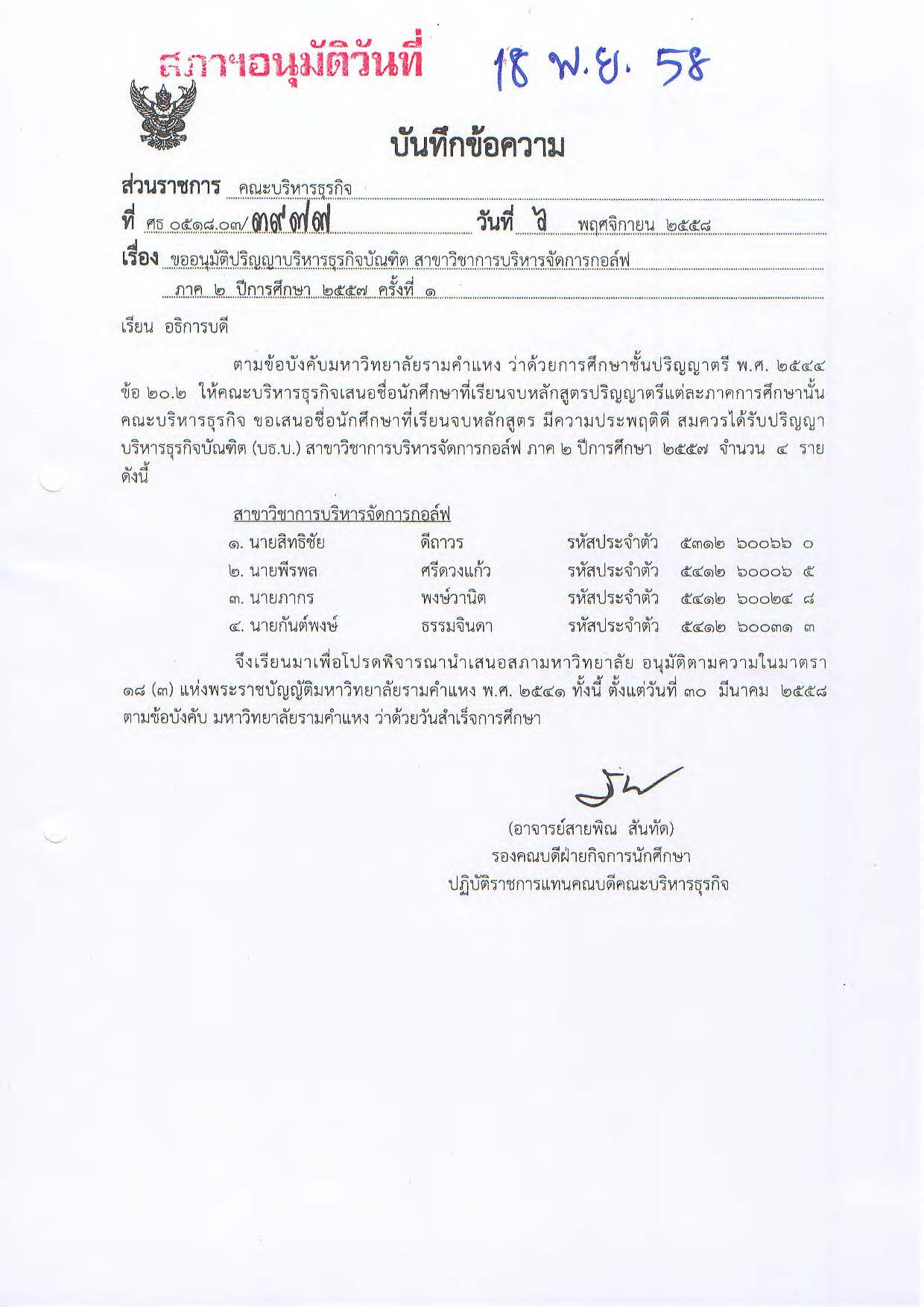 ขออนุมัติปริญญาบริหารธุรกิจบัณฑิต สาขาวิชาการบริหารจัดการกอล์ฟ ภาค 2 ปีการศึกษา 2557 ครั้งที่ 1Written by RU Golf Bachelor | | | Hits: 2258 Tweet